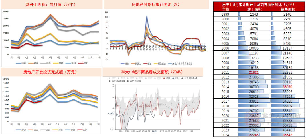 竣工情况和地产资金状况都表现疲软,新房销售同比仍未恢复。根据统计,今年前五个月全国房屋竣工面积达到了2.2亿平方米,与去年同期相比下降了20.1%,这一下降趋势已经连续两个月呈现收窄态势。2024年1-5月房地产销售面积、新开工面积累计同比分别为-20.3%(环比-0.1%)和-24.2%(环比+0.4%)。全国房地产开发投资同比减少10.1%,其中住宅投资下降10.6%,房地产开发企业到位资金同比减少24.3%。商品房待售面积达到74256万平方米,同比增长15.8%,其中住宅待售面积增长了24.6%。这表明上半年房地产市场依旧处于去库存阶段。