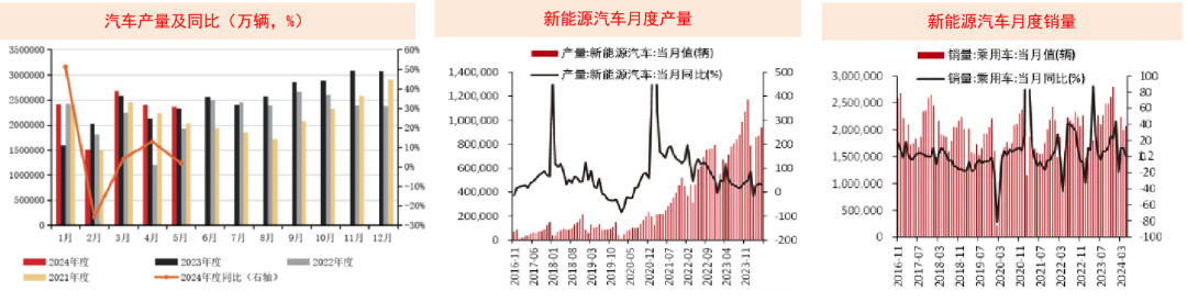 汽车产业作为玻璃行业的第二大需求领域,其需求量占比介于7%-10%之间,整体需求呈现出稳步上升的趋势。1-5月,我国汽车产量和销量分别达到1138.47万辆(同比+6.5%)和1149.6万辆(同比+8.3%)。由于受到欧美国家对中国新能源汽车增收高关税政策的影响,进入5月,汽车的产销量的增长势头有所减缓。同时下半年可能会减弱汽车产业对玻璃需求的驱动力。