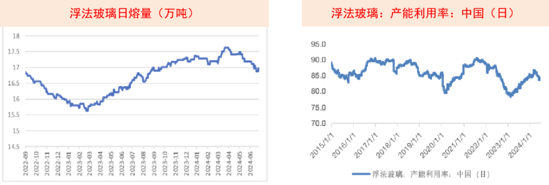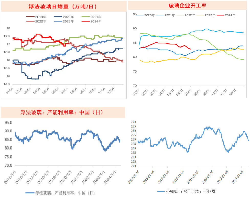在2024年第一季度,玻璃的产能和产量达到了上半年最高点,而在第二季度,日熔量逐渐减少;浮法玻璃目前的日设计产能为20.23万吨,产能利用率达到84.19%,日熔量为17.03万吨,同比增加3.3%,较2023年底下降1.8%,过去两三年的日熔量保持在70%的绝对水平。浮法产企业开工率82.72%。