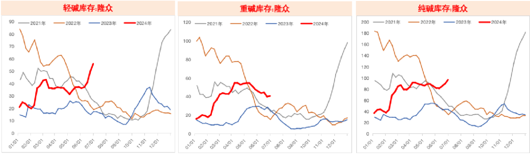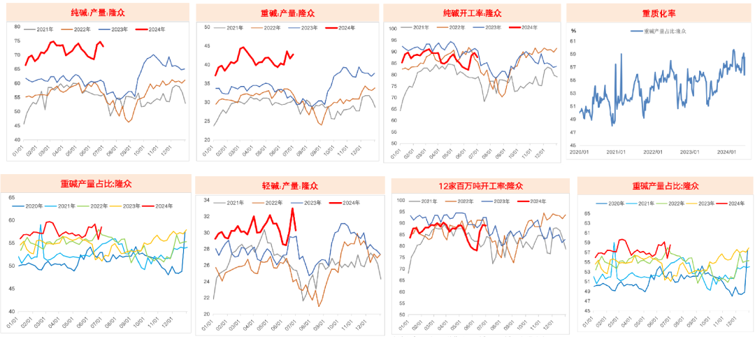 隆众化工,24年上半年纯碱产量同比增17.4%,其中一季度增17.3%,二季度增17.5%;上半年重质化率57.43%,去年上半年是54.65%,主要是去年下半年以来新投产能较多,其中重碱新增产能多于轻碱,7月第二周周产72.8万吨。今年以来纯碱产量持续处于历史最高水平。