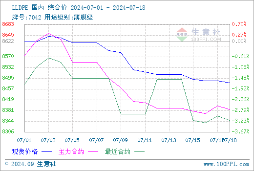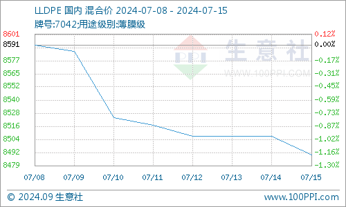 据生意社商品行情分析系统监测,LLDPE(7042)7月8日国内价格在8591元/吨,7月16日均价在8485元/吨,期间报价下跌幅度1.23%。