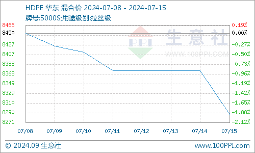 据生意社商品行情分析系统监测,HDPE(5000S)7月8日国内价格在8450元/吨,7月16日均价在8275元/吨,期间报价下跌幅度2.07%。
