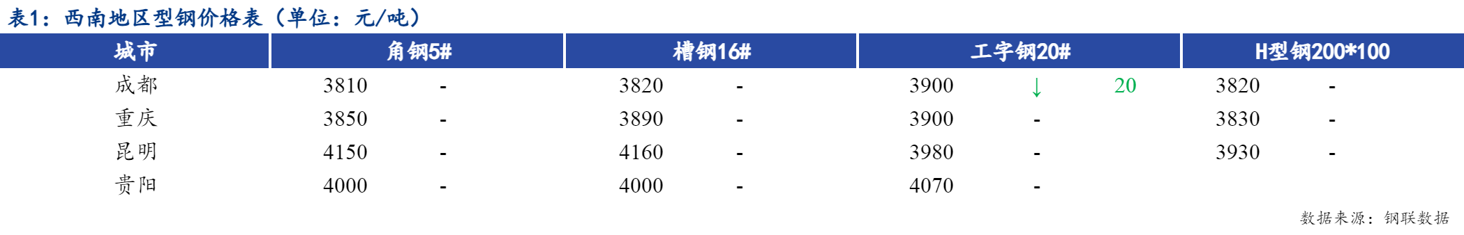 成都与重庆角钢价差不变,工字钢价差不变,H型钢价差不变;昆明和贵阳角钢价差扩大,工字钢价差价差缩小。