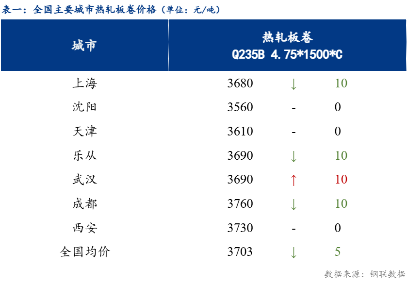 今日热轧板卷全国主要城市价格小幅下跌,截止发稿时3.0mm热轧板卷全国均价3766元/吨,较上一交易日跌5元/吨;4.75mm热轧板卷全国均价3703元/吨,较上一交易日跌5元/吨。分区域来看,今日各地市场涨跌互现,上涨幅度在-20-10元/吨左右。今日黑色商品期货震荡运行,10合约收涨0.05%,现货市场早盘价格基本持稳或小幅下跌,成交一般,午后盘面震荡,现货价格由于需求较弱,成交有所转弱,部分区域市场价格开始松动。