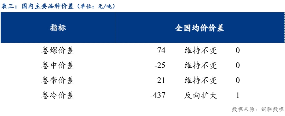从品种价差来看,卷螺差较上一交易日维持不变,热中价差较上一交易日维持不变,热带价差较上一交易日维持不变,热冷价差较上一交易日反向扩大1元/吨。