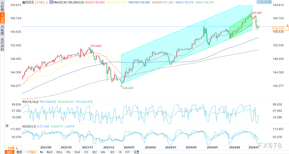 北京时间18:13,美元/日元报158.369/380,涨幅0.25%。