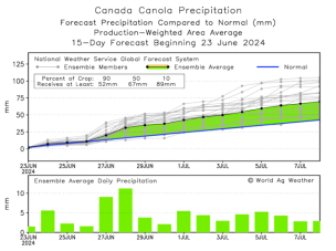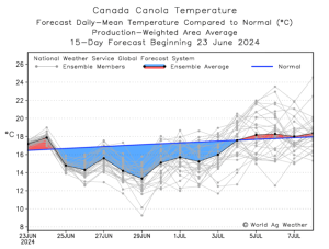 6月USDA报告预计2024/2025年度全球菜籽产量为8707万吨,维持丰产格局,但环比调减了127万吨,同比调减了167万吨,其中2024/2025年度澳大利亚菜籽产量环比调减100万吨,因澳大利亚西部和南部地区遭遇了干旱天气,但是对欧洲菜籽产量预估维持不变。4月下旬欧洲菜籽遭遇霜冻,欧盟委员会的数据显示2024/25菜籽产量环比下调63万吨。澳大利亚与加拿大菜籽播种季节为5-6月,油世界报道澳大利亚因为前期干旱种植面积下降了2%,部分当地机构预估减幅在5-7%,加拿大统计局预计菜籽面积为2139.4万英亩,同比下降3.4%,而单产上升2.4%,总产量下降约23万吨。加拿大与澳大利亚菜籽处于生长季,目前加拿大天气预报水温正常,不过7、8月份市场对异常气温和降水的忧虑或放大价格波动。