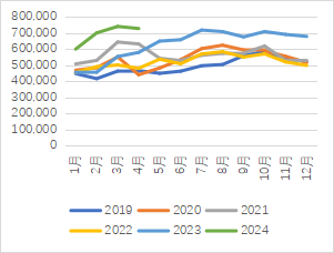 今年以来印尼生柴消费较好,1-4月生柴消费累计达到360.5万吨,同比增加13%。据Aporbi数据显示,2024年1-4月印尼生柴累计产量达到430万千升,同比增加9%。由于POGO价差相对偏低有利于印尼生柴的掺混,执行B35生物柴油掺混目标,2024年棕榈油消费增量预计在80-100万吨。