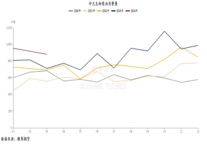 2024年以来东南亚棕榈油产量恢复较好,印尼产量处于同期高位,马棕产量持续处于均线以上,1-5月马棕产量累计达到726万吨,同比增加9%,印尼1-3月产量累计1337万吨,同比增加6.7%,三季度东南亚棕榈油将进入旺产期,继续保持增产趋势。不过印尼受去年厄尔尼诺影响,今年增产期可能增产不及预期。今年上半年东南亚遭遇持续的高温干旱天气,2-4月马来西亚累计降雨量处于历史同期低点,持续的高温干旱天气对四季度棕榈油产量将会造成不利影响,与季节性减产时间重合,且马来西亚的油棕树龄结构老化,四季度产量可能不容乐观。上半年马棕出口表现良好,1-5月累计出口492万吨,同比增加7%。目前国际豆棕油价差走扩,棕榈油比价优势突出,印度棕榈油进口利润尚可,而豆油与葵花油进口利润下降,随着棕榈油逐渐进入增产旺季,三季度印度或将加大对棕榈油的进口,棕榈油供需双增,产地或继续小幅累库。
