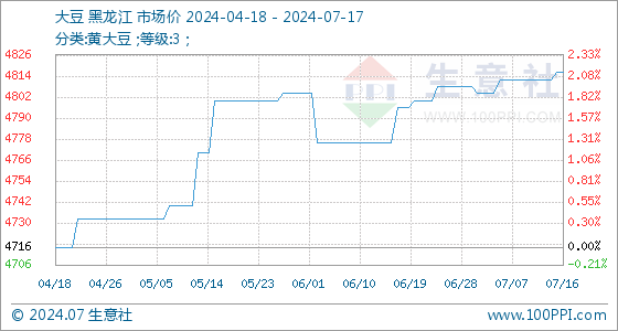 7月17日,生意社大豆基准价为4816.00元/吨,与本月初(4808.00元/吨)相比,上涨了0.17%。