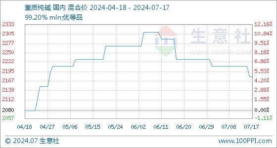 7月17日,生意社重质纯碱基准价为2180.00元/吨,与本月初(2230.00元/吨)相比,下降了-2.24%。