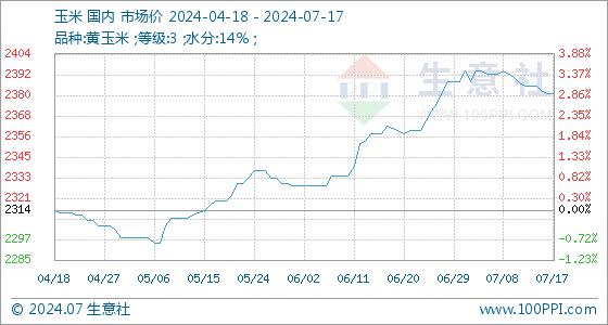 7月17日,生意社玉米基准价为2381.43元/吨,与本月初(2388.57元/吨)相比,下降了-0.30%。