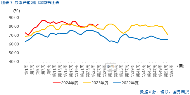尿素供应小幅恢复,符合上周预期。截至7月4日,尿素周度平均日产量 17.89 万吨,较上期增加了0.55 万吨,产能利用率达到82.62%,增加了2.56个百分点。周期内有部分装置临时检修,但总数小于恢复产能,不过由于7月中旬内蒙、东北企业存在计划检修,预计产量窄幅波动运行。国际尿素方面,埃及至少有6家生产商从7月2日起开始恢复其工厂生产,不过由于需求较为旺盛,短期之内国际尿素整体供需依旧偏紧。