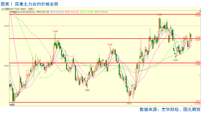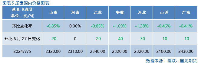 尿素本周先涨后跌,整体呈现震荡。截至7月5日星期五,尿素2409合约收盘于2136元/吨,目前山东尿素价格在2310元/吨,基差为174元/吨,小幅缩窄。盘面来看,尿素2409合约价格达到前期震荡区附近,行情上行存在压力,周内大概率在60日均线之上震荡运行。