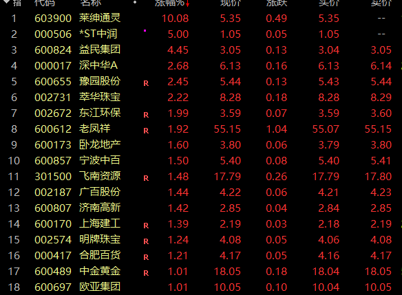 7月17日上午,A股黄金珠宝板块走势较强,截至发稿莱绅通灵10%涨停,老凤祥涨超2%,曼卡龙、明牌珠宝、潮宏基、迪阿股份等黄金类上市公司股价整体飘红。