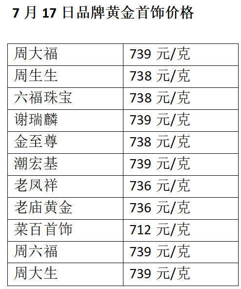 品牌黄金价格方面,7月17日,周大福、周生生、六福珠宝、周六福、周大生等全国主要品牌黄金首饰价格普遍报价736元—739元/克,创下历史新高,仅有少数品牌黄金首饰报价712元/克,如菜百首饰。