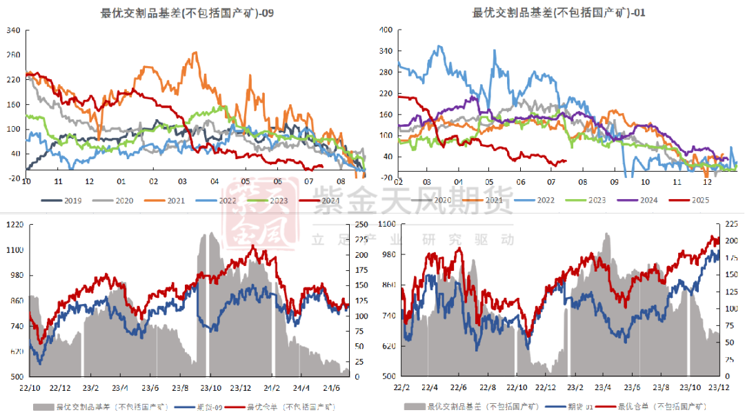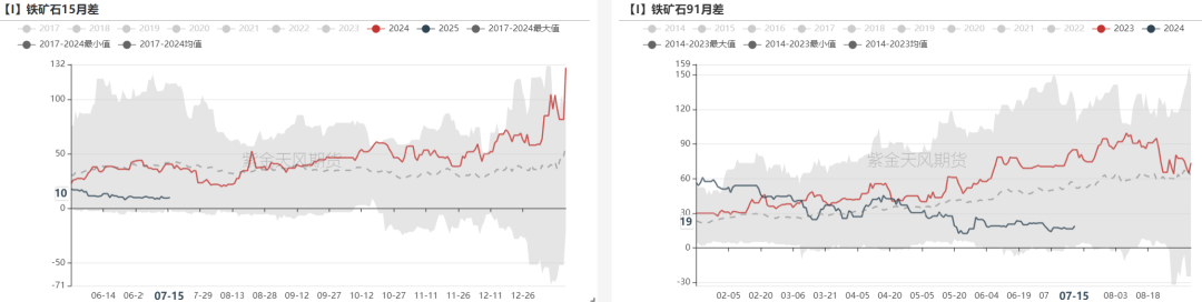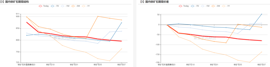 现货铁矿现货成交量下行,09合约基差率1.2%左右,基差环比走扩,基差率上行。