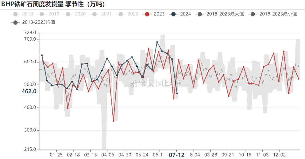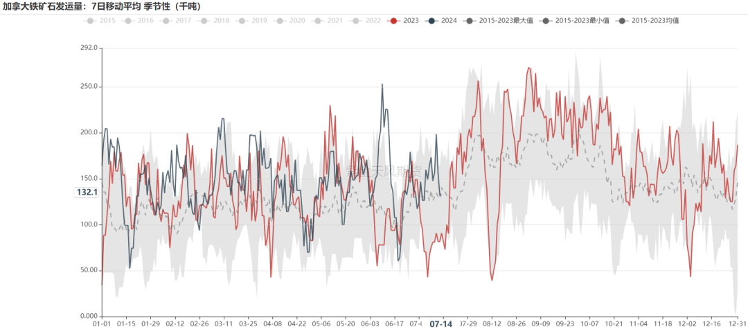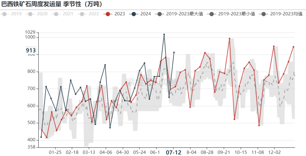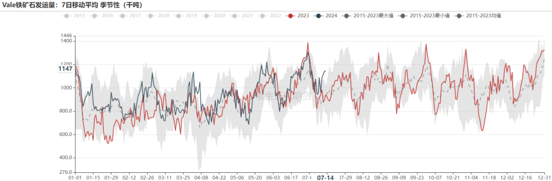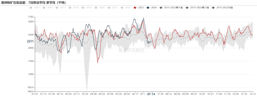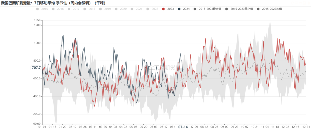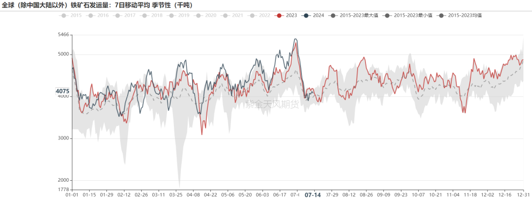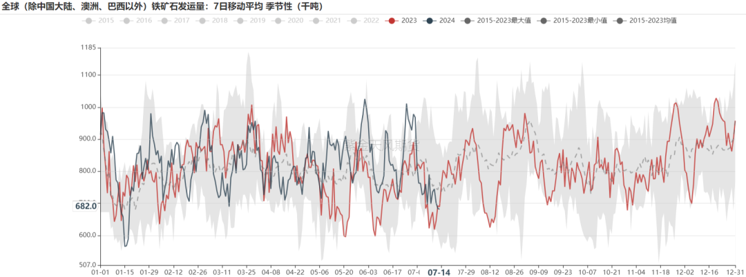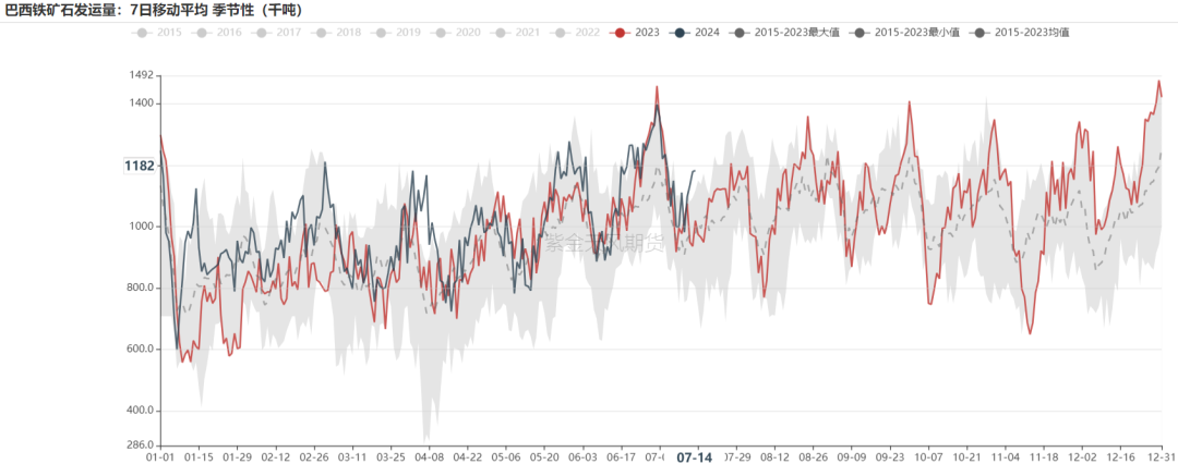 路透口径:2024年7月14日,路透全球铁矿7日移动平均发货量4075千吨,周环比减5.5%,同比减2.5%。澳洲7日移动平均发货量2211千吨,周环比减8.6%,同比减10.5%;巴西7日移动平均发货量1182千吨,周环比增2.8%,同比增16%。