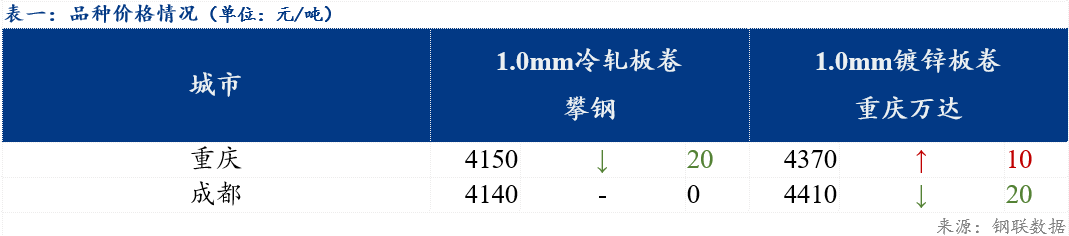 具体来看,冷轧方面:今日期货热卷价格午后大跳水,市场心态多悲观,商家主动降低价格,但当前市场需求较为有限,跌价并未带动成交好转。据悉,冷轧板卷价格与期货热卷关系多表现为遇跌跟跌、遇涨难涨,因此冷热价差持续收窄,且短时间修复难度大。加上年内冷轧现货价格单边下跌,短期商家对于后市行情走势持谨慎观望态度居多。据西南贸易商反馈,为规避风险,降低资金和库存压力,操作上多以让利出售,回笼资金为主。综合来看,预计明日冷轧价格或将窄幅震荡调整运行为主。镀锌方面:热轧基料价格重心继续下移,成都市场镀锌现货价格跟随下跌。市场交投氛围冷清,贸易商情绪低落。从区域价差来看,华北区域价格跌速与西南区域相当,区域价差维持在210元/吨左右,价差仍在火运成本之内,不具备北材南下的条件。终端需求表现未有起色,贸易商多以出货为主,加之市场各品牌竞争相对激烈,普遍以成交为主。