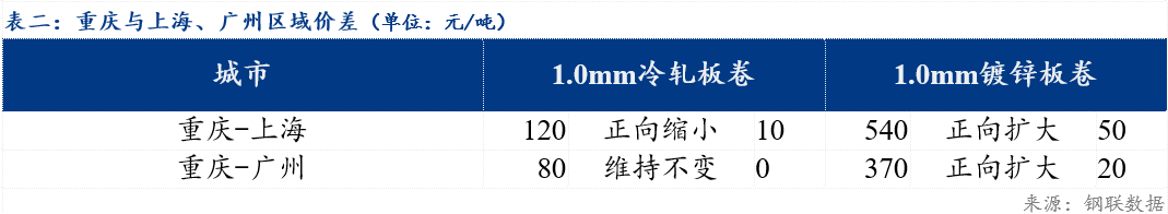 重庆、上海地区冷轧板卷区域价差缩小10元吨;重庆、广州冷轧板卷区域价差维持不变 。重庆、上海镀锌板卷区域价差扩大50元/吨 ;重庆、广州镀锌板卷区域价差扩大20元/吨。镀锌、冷轧品种价差扩大30元/吨 ;镀锌、热轧品种价差扩大30元/吨 ;冷轧、热轧品种价差维持不变 。