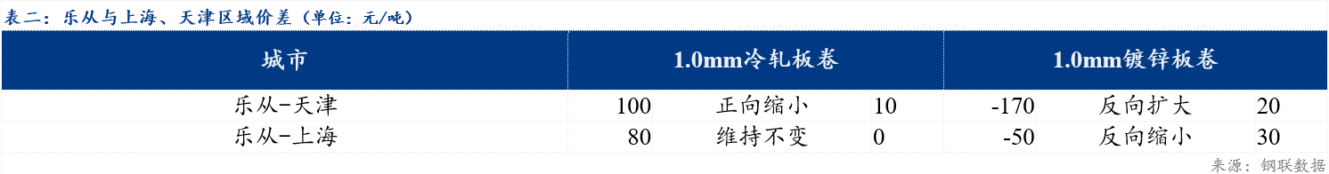 今日冷轧板卷乐从与天津价差较上一交易日收窄10元/吨,乐从与上海价差较上一交易日持平;镀锌板卷乐从与天津价差较上一交易日扩大20元/吨,与上海价差较上一交易日收窄30元/吨。品种价差方面,镀冷价差较上一交易日收窄10元/吨,镀热价差较上一交易日扩大20元/吨,冷热价差较上一交易日扩大30元/吨。