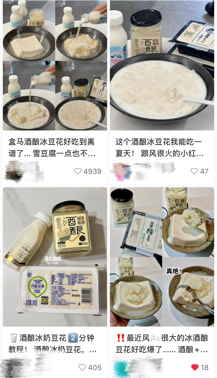 近日一款自制“酒酿冰豆花”火遍社交平台,一度让盒马自有品牌的一款孝感酒酿卖断了货。数据显示,最近一周盒马孝感酒酿销售环比增长了60%。有不少网友发现,如今的酒酿商品和小时候用来冲蛋花的酒酿已经大不相同,而就是这个“不同”也让酒酿成为甜品界的“黄金配角”。