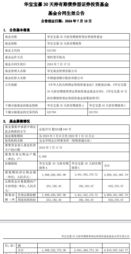 华宝宝嘉30天持有期债成立募集金额48亿元