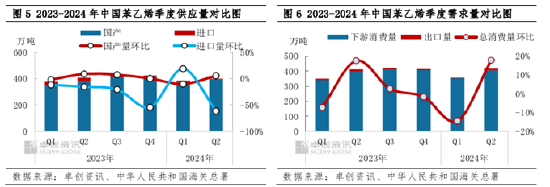 2024年二季度国内苯乙烯价格基本呈现高位震荡的走势,截至6月30日江苏苯乙烯一季度均价在9576元/吨,环比上涨6.52%,同比上涨20.99%。其中季度高点出现在5月31日9880元/吨,低点出现在5月15日9295元/吨,价格波动幅度在6.29%。主要影响逻辑如下:1. 纯苯缺乏进口货源补充,主港去库支撑价格震荡上涨,给予苯乙烯偏强支撑;2、国际油价跌多涨少,阶段性施压苯乙烯价格下跌;3.二季度苯乙烯供应增幅不及需求增幅,且供应量绝对值小于需求量绝对值,供需结构表现强于预期,也支撑价格偏强运行。4、季度末市场开始交易原料纯苯7月走弱预期,苯乙烯价格受情绪面影响下跌。