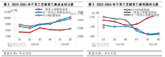 成本涨幅不及苯乙烯,各工艺装置利润均环比改善。二季度乙苯脱氢(非一体化)装置原料纯苯上涨,乙烯下跌,非一体化装置成本环比上涨4.45%,季度现金流利润在-284元/吨,环比增加7.79%;一体化装置方面,原料布伦特原油季度均价环比上涨4%,同时人民币汇率也环比上涨0.06%,换算一体化装置成本环比上涨2.29%,季度理论利润在1354元/吨,环比增加37%;PO/SM装置原料成本中丙稀和纯苯环比上涨,乙烯环比下跌,装置总体原料成本环比上涨4.75%,而联产产品环氧丙烷季度均价也环比上涨2.07%, PO/SM装置季度理论利润在-586元/2.17吨,环比增加10.67%。