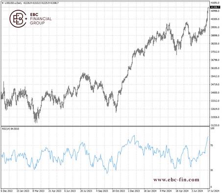 道指历史上第一次站上4.1万,不过看上去超买程度非常可观。如果该重要位置失守,可能出现较深的回撤。