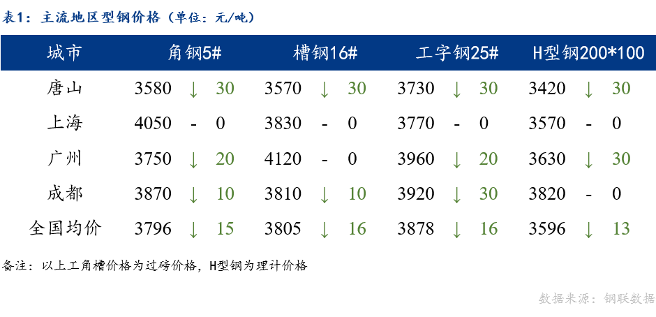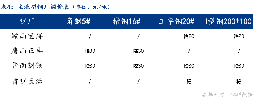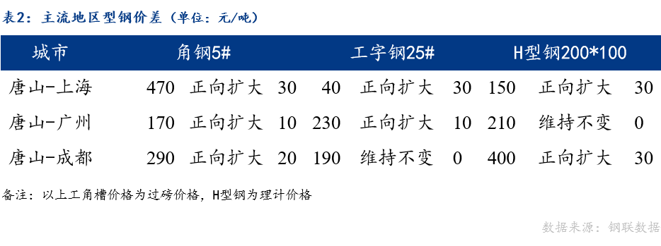 从区域价差来看,唐山与上海角钢、工字钢、H型钢,与广州角钢、工字钢,以及与成都角钢、H型钢价差正向扩大;唐山与广州H型钢,与成都工字钢价差维持不变。