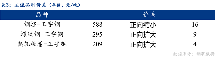 从品种价差来看,工字钢与钢坯价差正向缩小;工字钢与螺纹钢、热轧板卷价差正向扩大。