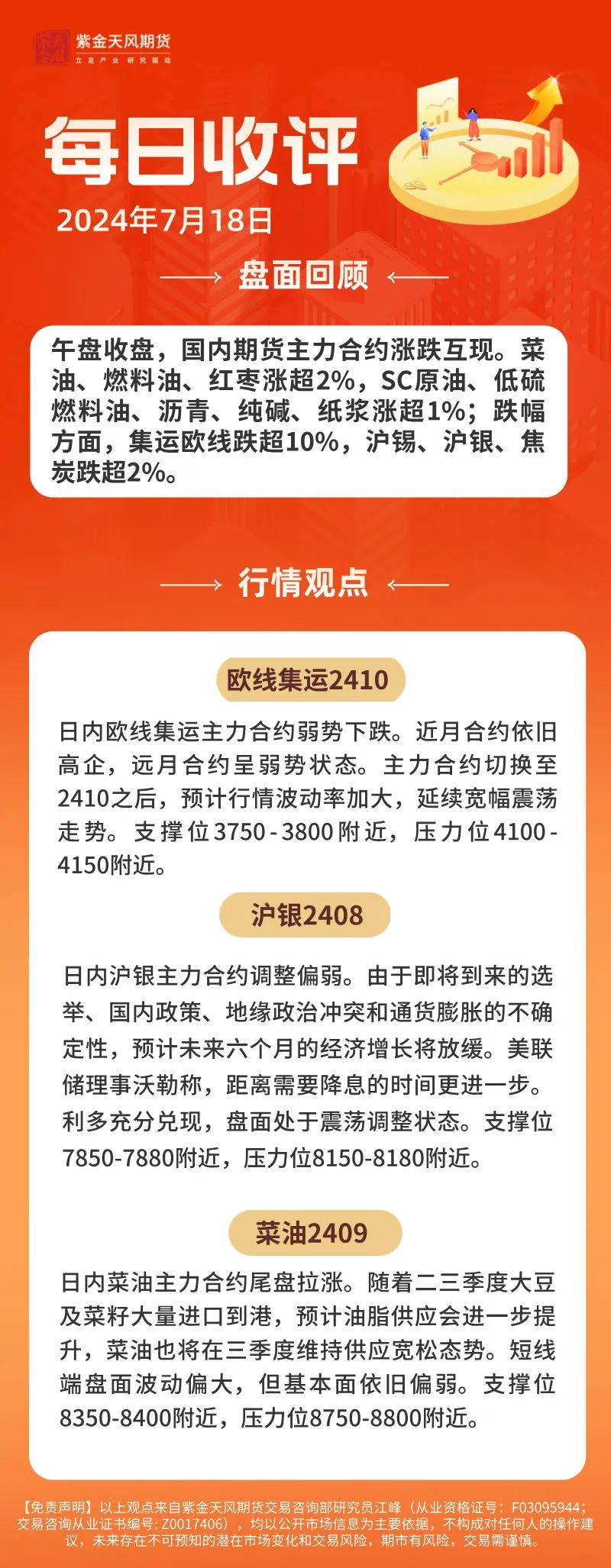 2024年7月18日,今日国内期市整体表现略偏强,石油和油脂板块涨幅榜居前,市场多头情绪略占优。