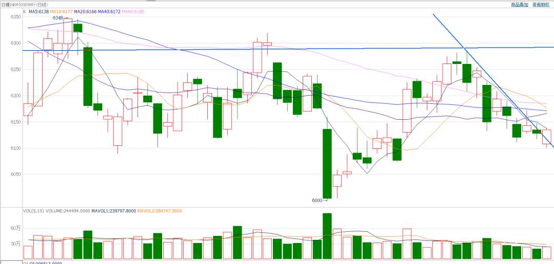 截至前一个交易日收盘,白糖低开高走,收小阳线。日k线6300存在较强压力,大方向仍为弱势。