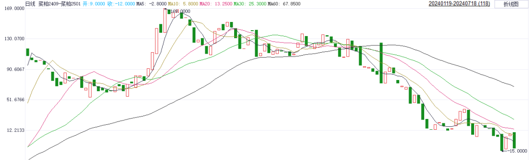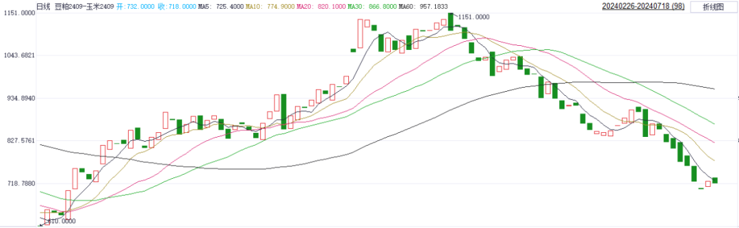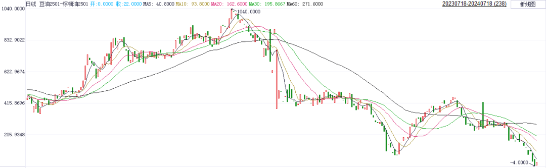 远月豆油与棕榈油价格倒挂严重,二者差价结构处于不合理范围区间,由于豆油富含更丰富对人体有利的营养成分,其食用消费价值远高于棕榈油。2501合约棕榈油进入年底随着气温下降,在冬季油脂参兑中比例将回下降,棕榈油消费需求会随之减弱。而豆油进入冬季消费总量更为平稳。目前,远期合约二者价格已出现一定幅度倒挂,未来豆油在油脂市场价格方面更具市场竞争优势。故可适当关注二者做多差价的机会。