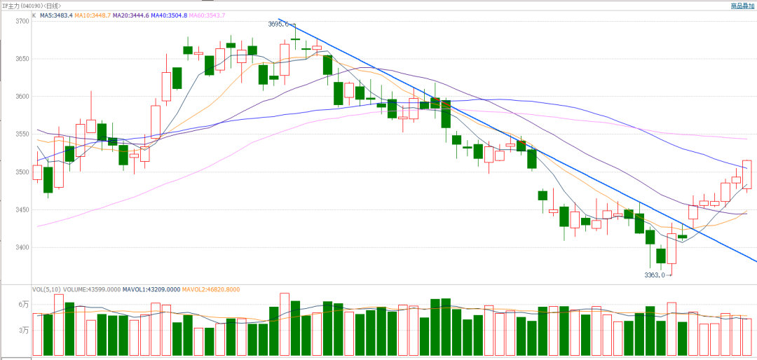 截至前一个交易日收盘,IF低开高走,收中阳线。日k线近期连续反弹,前期下跌行情告一段落。
