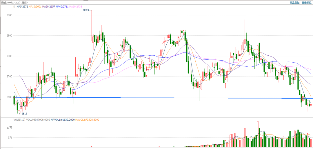 截至前一个交易日收盘,烧碱窄幅波动,收小阳线。日k线破位下行,跌破2600关键位置支撑。