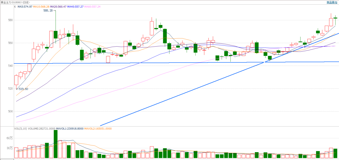 截至前一个交易日收盘,黄金探底回升,收小阴线。日k线近期持续反弹,处于主升浪。