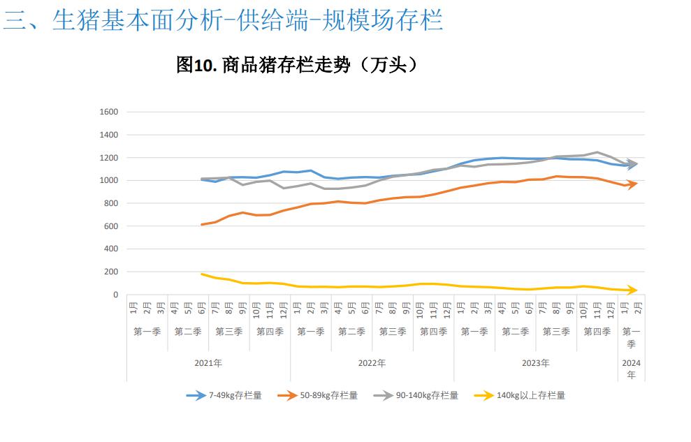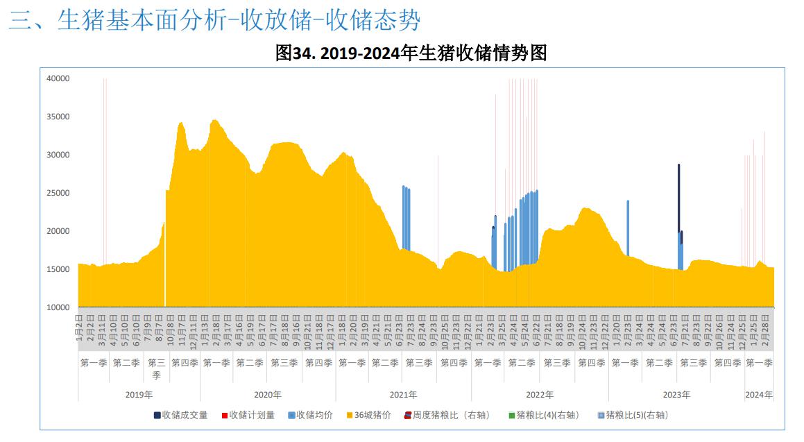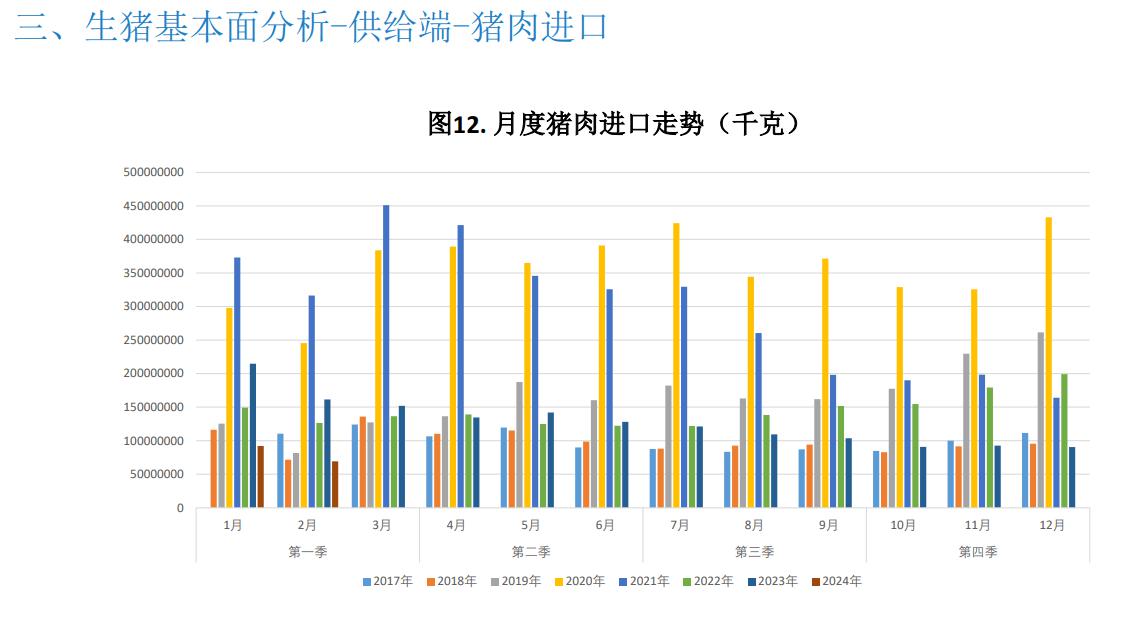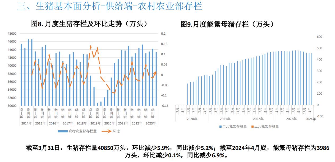 3.库存:截至3月31日,生猪存栏量40850万头,环比减少5.9%,同比减少5.2%;截至2024年5月底,能繁母猪存栏为3996万头,环比增加0.2%,同比减少6.2%;我的农产品(000061)调查重点企业能繁母猪5月底存栏量为487.59万头,环比增加0.38%;商品猪存栏3370.28万头,环比增加0.95%。偏空。