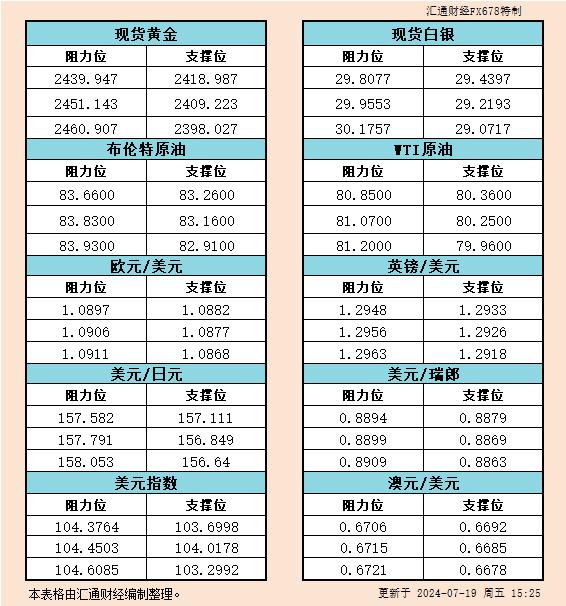 汇通财经APP讯——7月19日欧市黄金、白银、原油、美元指数、欧元、英镑、日元、瑞郎、澳元支撑阻力位一览。