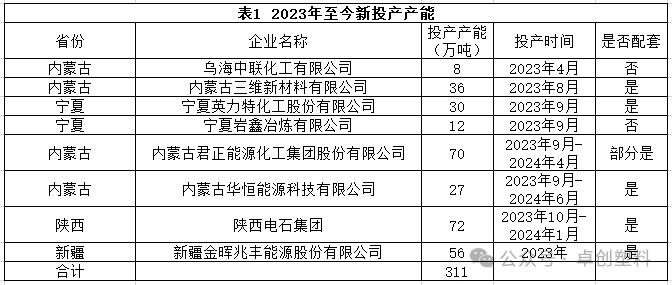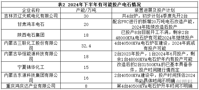 2023年下半年投产电石炉产量在2024年上半年逐步得到释放,产量逐步稳定,供应量增加,上表数据显示,2023年至今电石总共新投产产能311万吨,下半年至今投产303万吨,较多产能在去年下半年开工不稳定,今年上半年才逐渐趋于稳定。上述投产项目中,较多为配合下游装置配套所投产,部分投产时间早于下游,或是下游仍处于生产不稳定状态,导致此些装置中有较多电石量外销,对2024年上半年市场形成一定拖累。