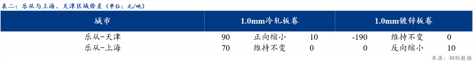 今日冷轧板卷乐从与天津价差较上一交易日收窄10元/吨,乐从与上海价差较上一交易日持平;镀锌板卷乐从与天津价差较上一交易日持平,与上海价差较上一交易日收窄10元/吨。品种价差方面,镀冷价差较上一交易日收窄10元/吨,镀热价差较上一交易日收窄20元/吨,冷热价差较上一交易日收窄10元/吨。