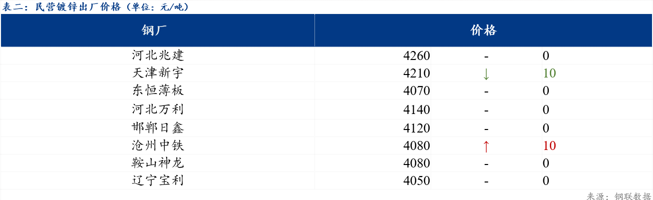 现北方地区民营镀锌板卷整体出厂价格在4050-4260元/吨。