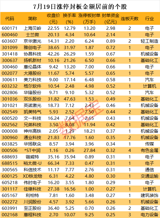以封单金额计算,半导体板块上海贝岭、士兰微、京华激光封单金额分别为2.98亿元、2.14亿元、8928.04万元。