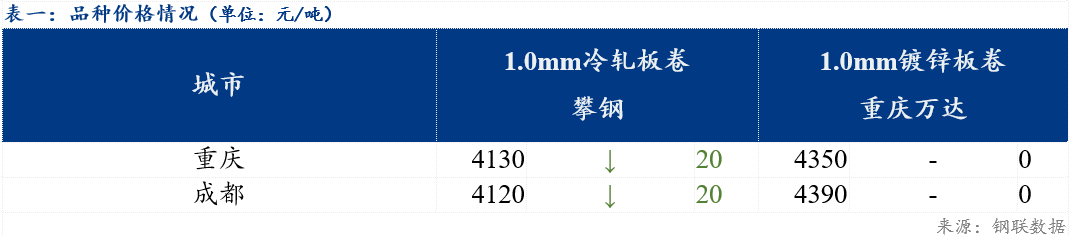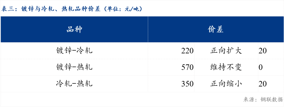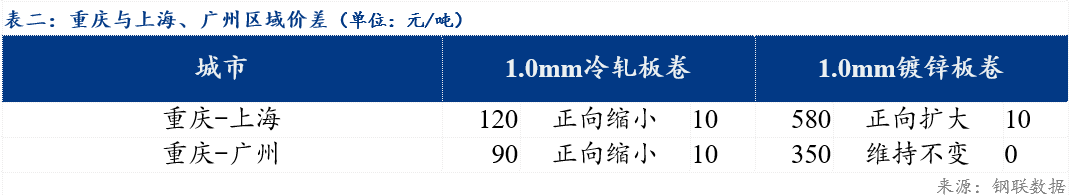 重庆、上海地区冷轧板卷区域价差缩小10元/吨;重庆、广州冷轧板卷区域价差缩小10元/吨。重庆、上海镀锌板卷区域价差扩大10元/吨;重庆、广州镀锌板卷区域价差维持不变。镀锌、冷轧品种价差扩大20元/吨;镀锌、热轧品种价差维持不变;冷轧、热轧品种价差缩小20元/吨。