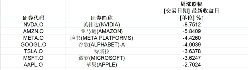 “科技股七姐妹”集体下挫。上周,英伟达跌幅居首,累计下跌8.75%,创4月19日以来最大单周跌幅;亚马逊紧随其后,下跌5.84%,连跌两周;Meta、谷歌母公司Alphabet累计跌幅均超4%;特斯拉、微软跌幅均超3%;苹果跌2.7%。