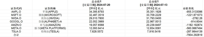 市值方面,上周,英伟达市值变化最大,累计下降2782.26亿美元,微软、亚马逊市值均减少超1000亿美元。“科技股七姐妹”上周市值累计蒸发7904.29亿美元(折合人民币约57443.96亿元),超过特斯拉最新总市值。