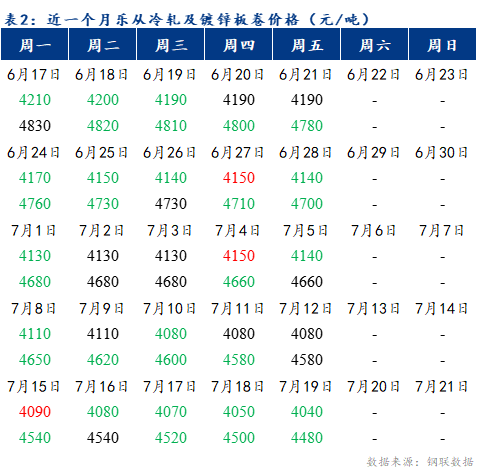 截止2024年7月19日17:30,冷轧板卷月均价为4121元/吨,镀锌板卷月均价为4652元/吨。