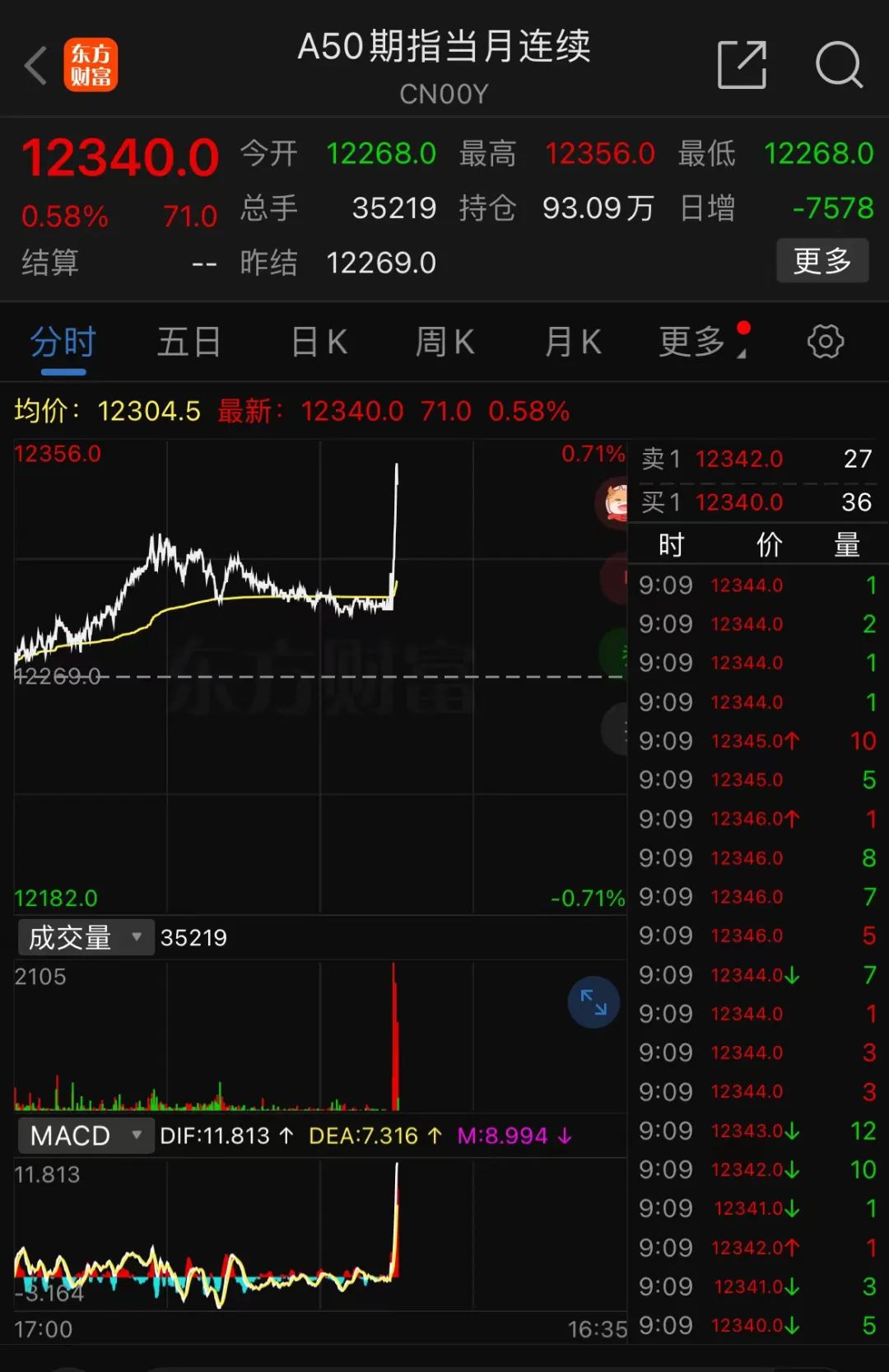 A50指数盘中拉升,截至发稿,涨0.58%,报12340.0点。