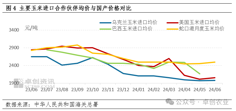 2024年6月份主要贸易伙伴国进口玉米价格与内贸价格对比,进口玉米相对国内玉米价格优势扩大。进口乌克兰玉米6月到港完税参考均价1976元/吨;进口美国玉米6月到港完税参考均价2051元/吨。2024年6月国内玉米随贸易环节话语权提高,成本累积以及贸易心态对市场价格均成交利多影响,全国玉米均价维持上涨走势,东南沿海内贸玉米价格同步上涨。6月以蛇口港为例的东南沿海玉米均价在2491元/吨左右,乌克兰玉米较国产玉米低514元/吨左右;美国玉米较国产玉米低439元/吨左右。单从价格来看,国际玉米价格相比国内玉米价格优势提高,但由于我国玉米进口受到配额政策限制,所以进口量依旧持续低位。